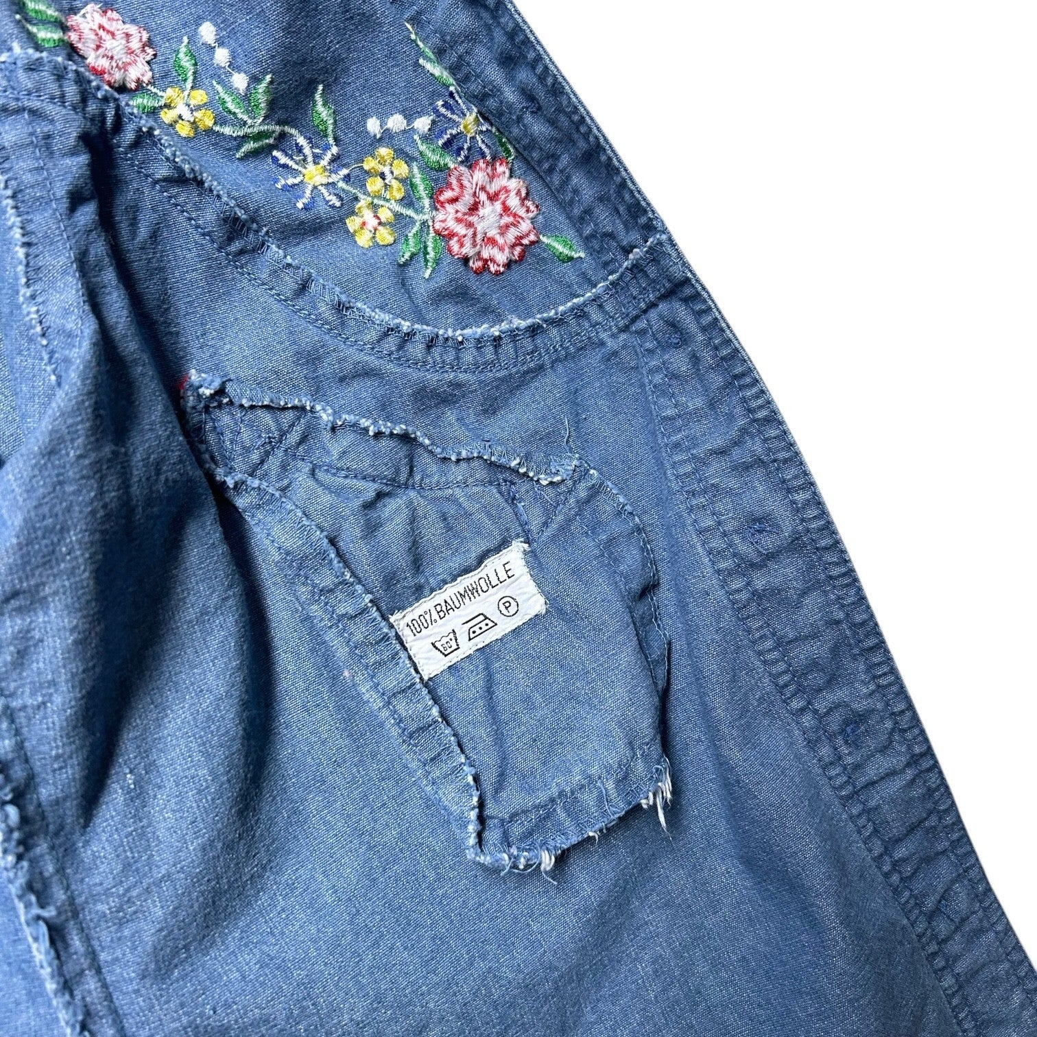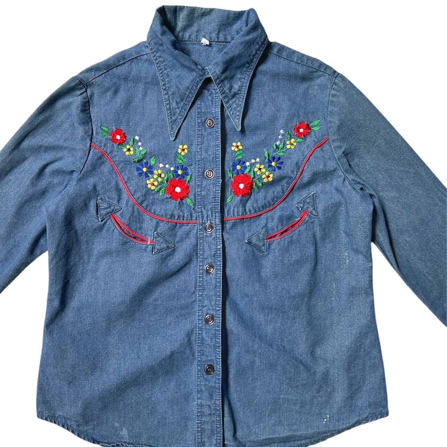 70s vintage embroidered denim shirt with pointed dagger collar.