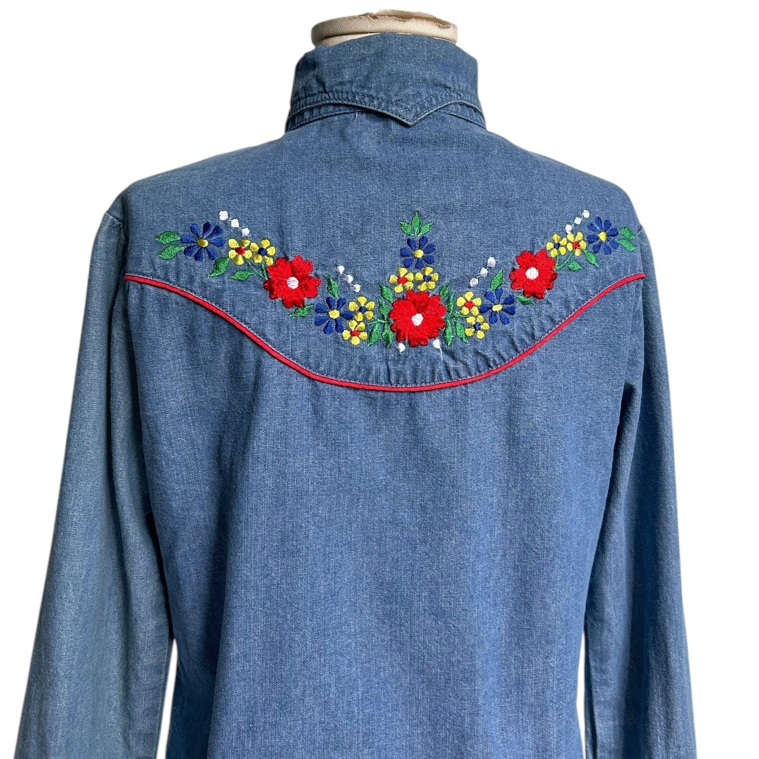Pointed dagger collar, buttons up front, western red piping details and little front pockets