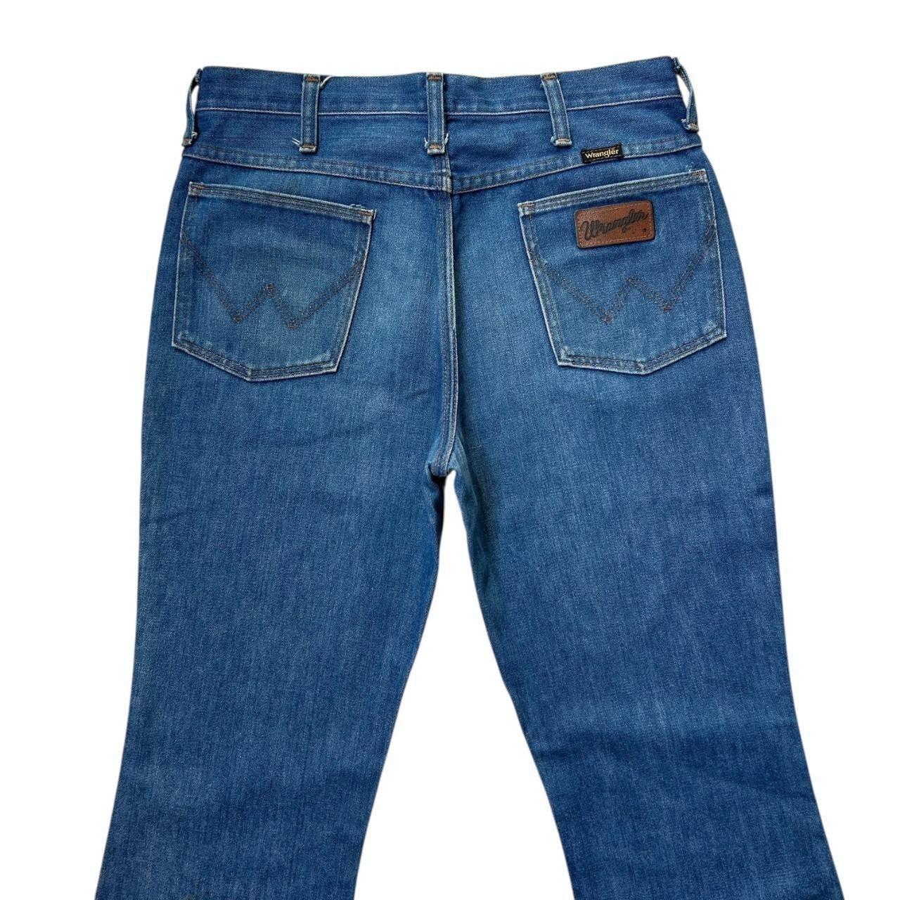 70s vintage highwaisted flare jeans by Wrangler, Ideal zipper. Faded bootcut western denim.