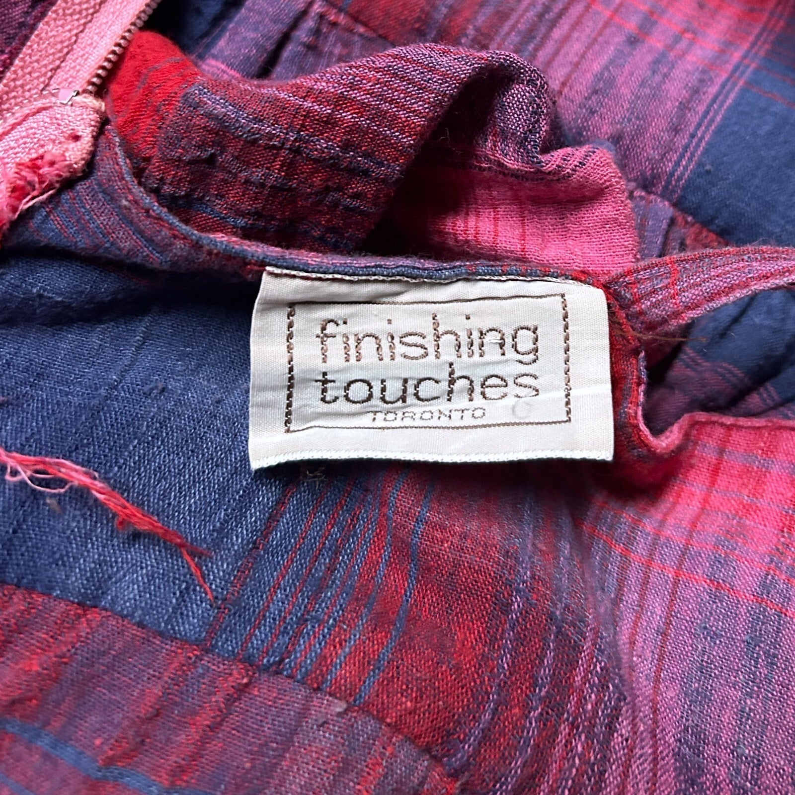No material tag, lightweight textured cotton material; purple and pink plaid pattern